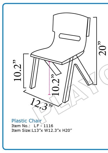 Details: It's a beautiful strong and sturdy school study chair for multipurpose Strong and Durable Chair. Fully molded plastic. Non-Toxic. Weather resistant. Water proof. Can be used indoors and outdoors. Dimensions (LxWxH): 35 x 36 x 51 cms. Seat Height: 26 cms
